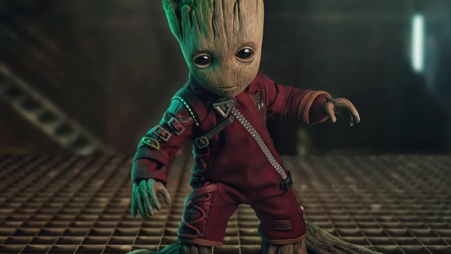 4k Guardians Of The Galaxy With Baby Groot In Red Suit Wallpaper