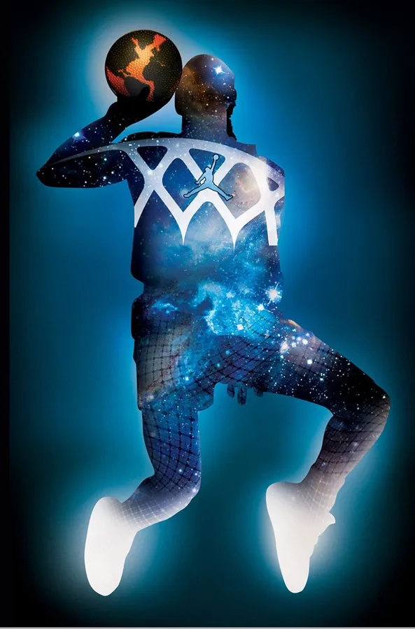 A Basketball Player Is Jumping In Space With A Ball Wallpaper