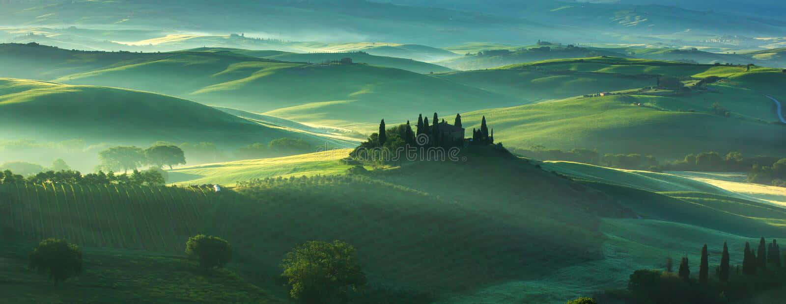 A Beautiful Landscape With Green Hills And Trees Wallpaper