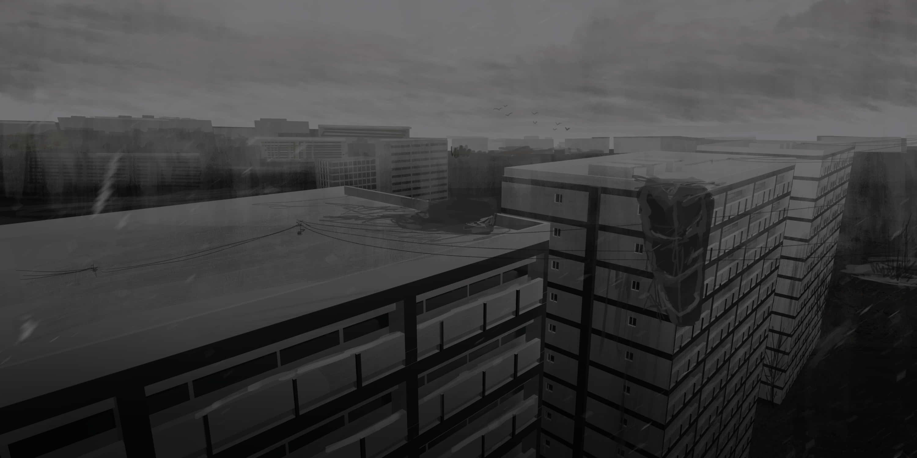 A Black And White Drawing Of A City With Buildings Wallpaper