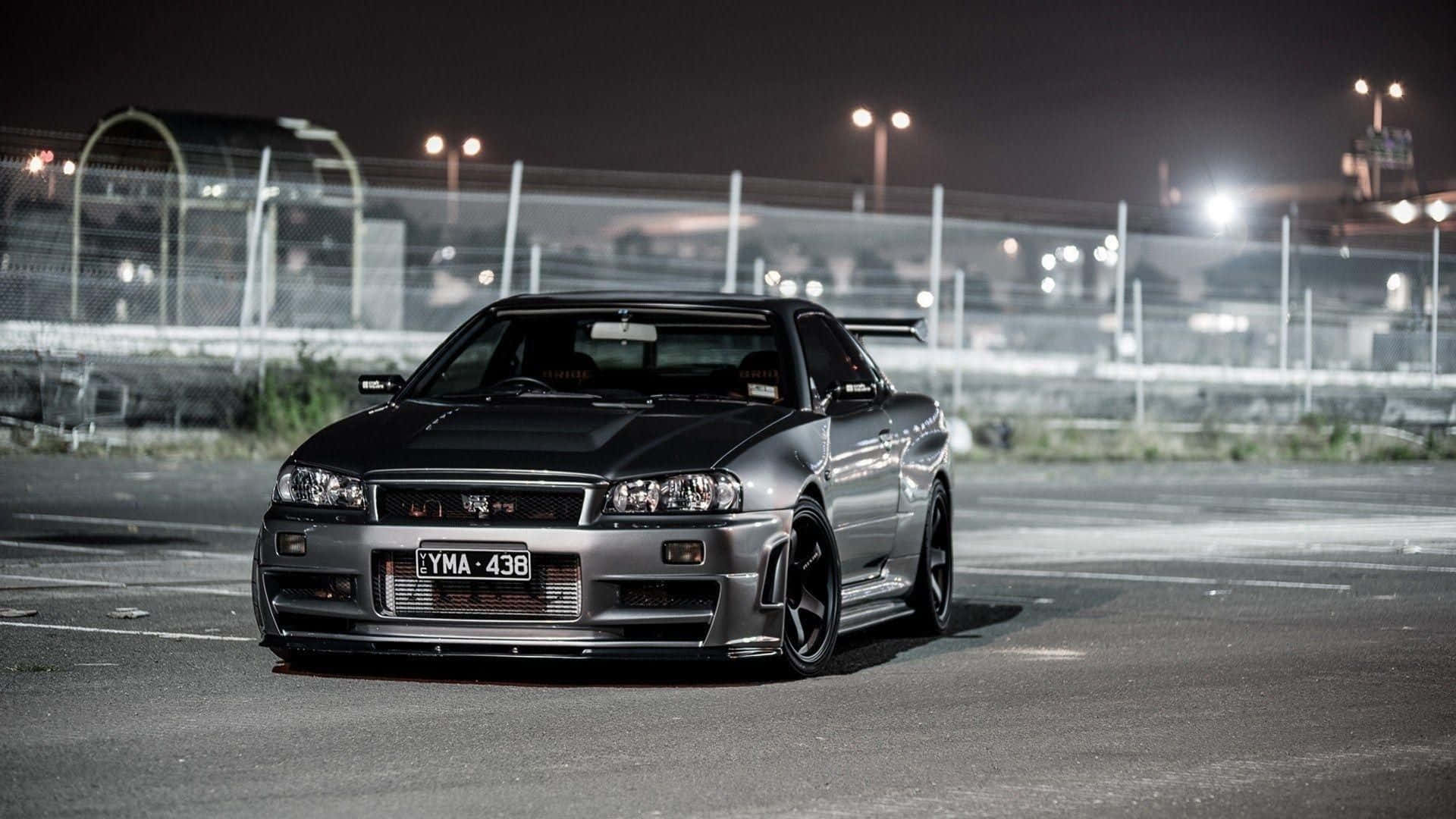 A Black Car Parked In A Parking Lot At Night Wallpaper