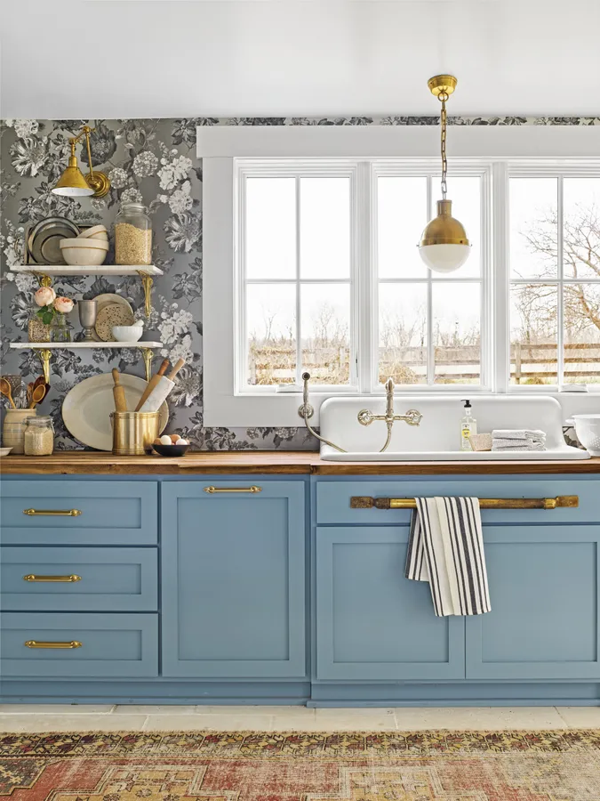 A Blue Kitchen With A Rug And Blue Cabinets Wallpaper