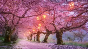 A Field Of Night Cherry Blossom Trees, Illuminated By The Stars Above. Wallpaper