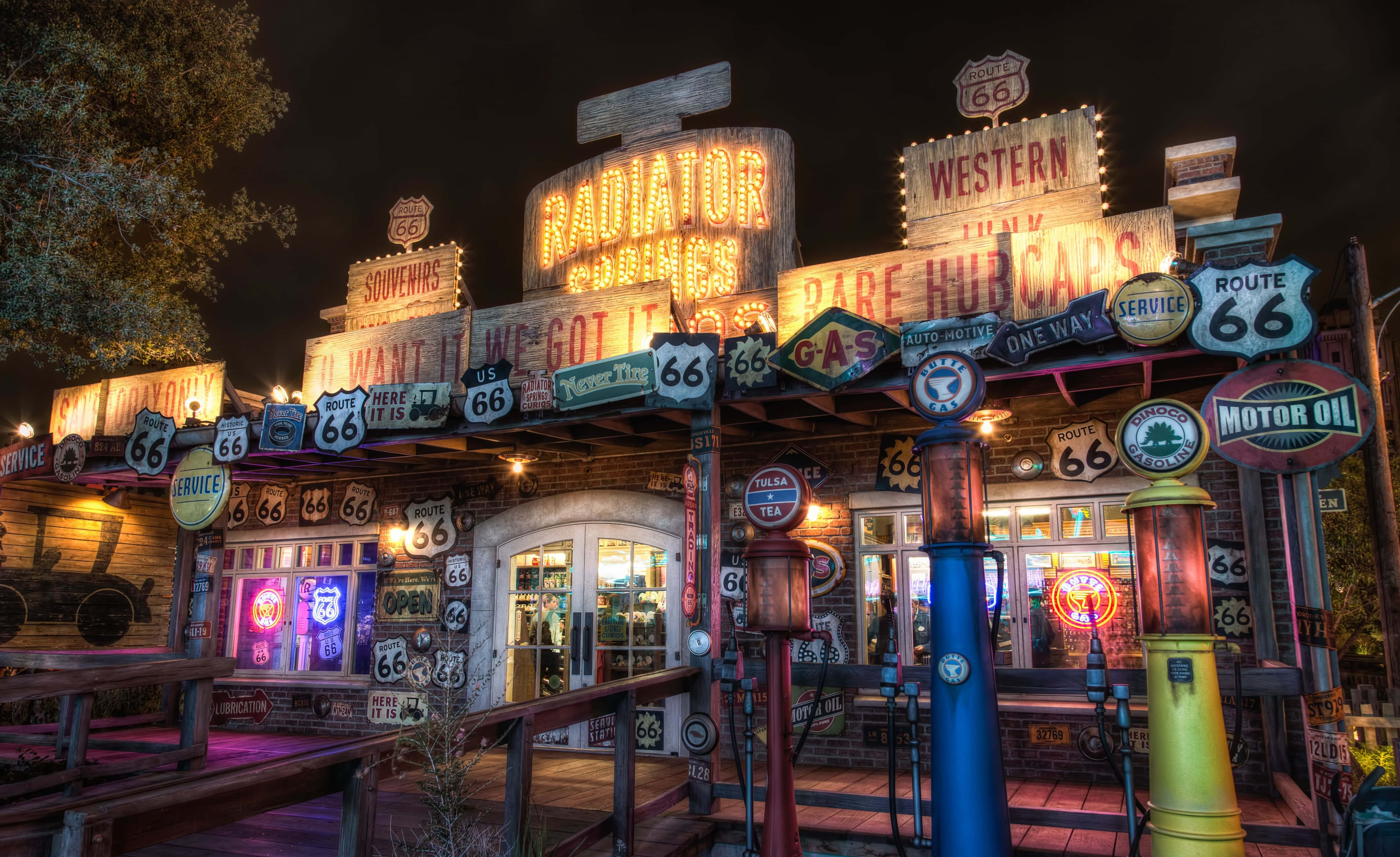A Gas Station With Many Signs And Lights Wallpaper