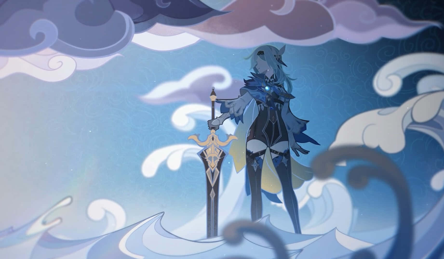 A Girl With A Sword Standing On A Cloud Wallpaper