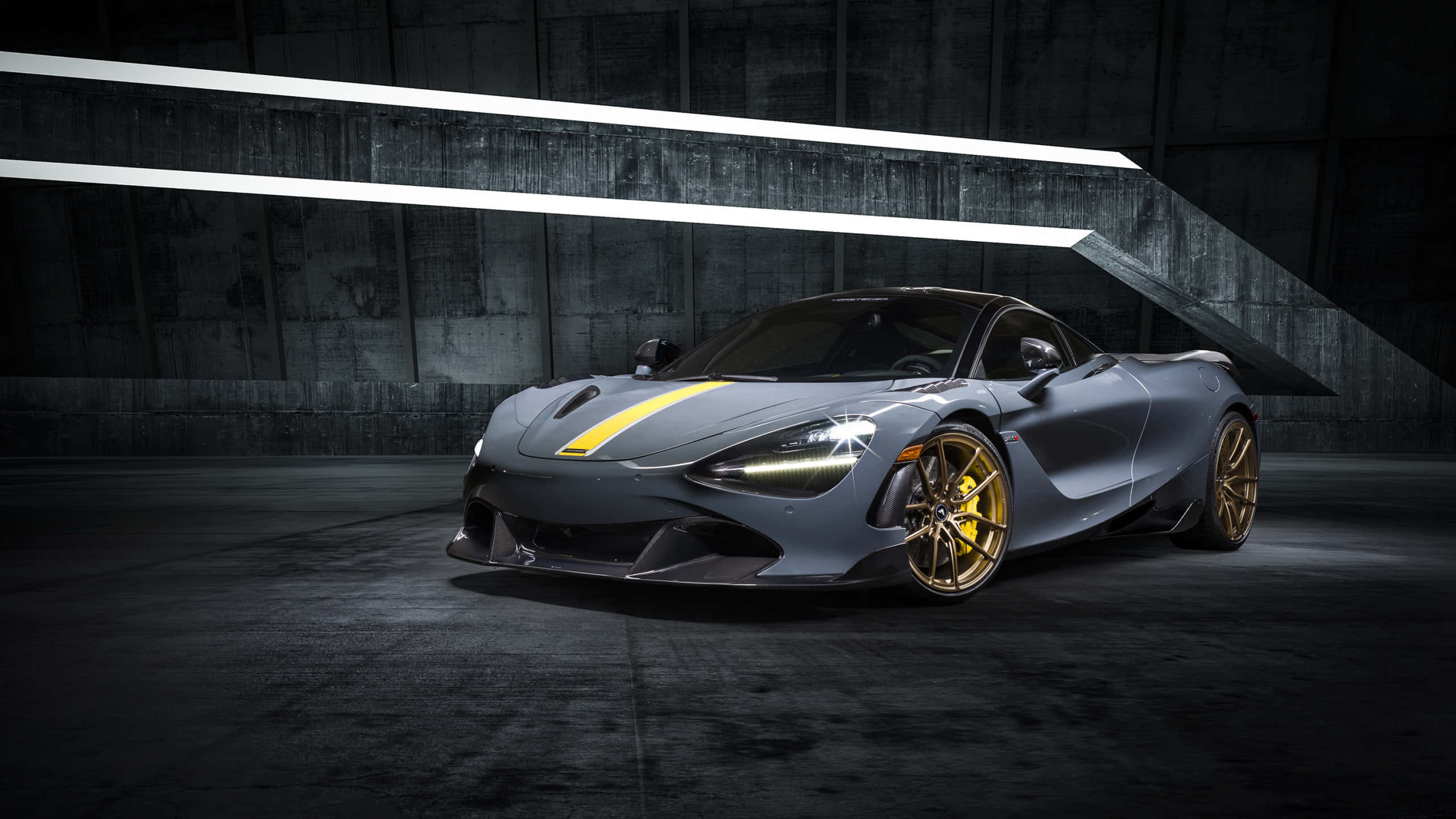 A Grey Sports Car Is Parked In A Dark Room Wallpaper