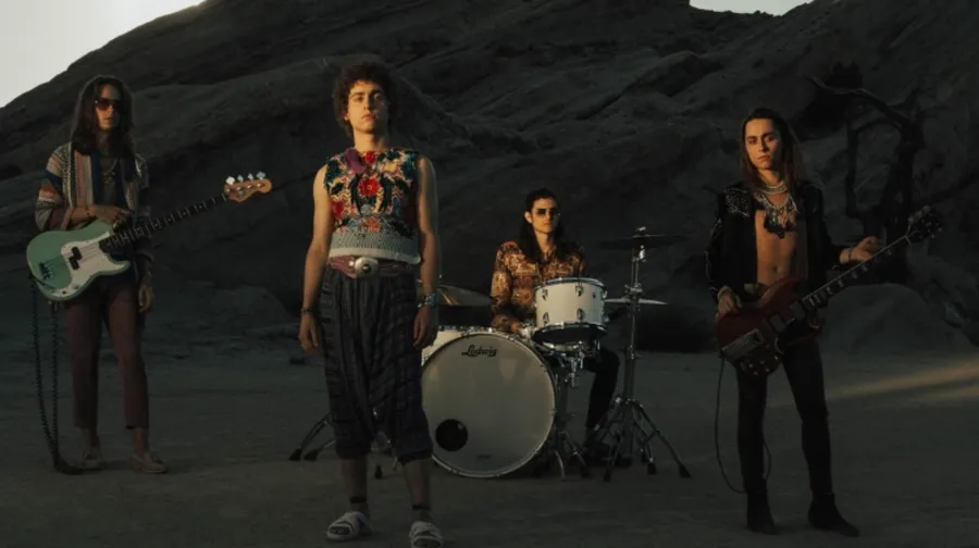 A Group Of People Standing In Front Of Rocks With Guitars Wallpaper