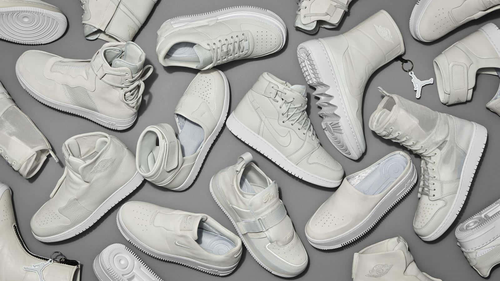 A Group Of White Sneakers Arranged On A Grey Background Wallpaper