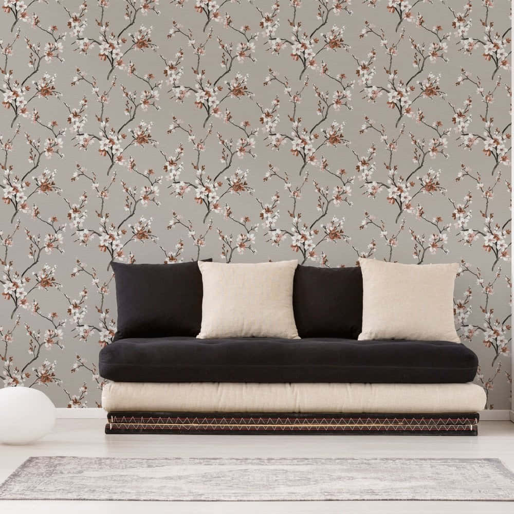 A Living Room With A Couch And A Floral Wallpaper Wallpaper