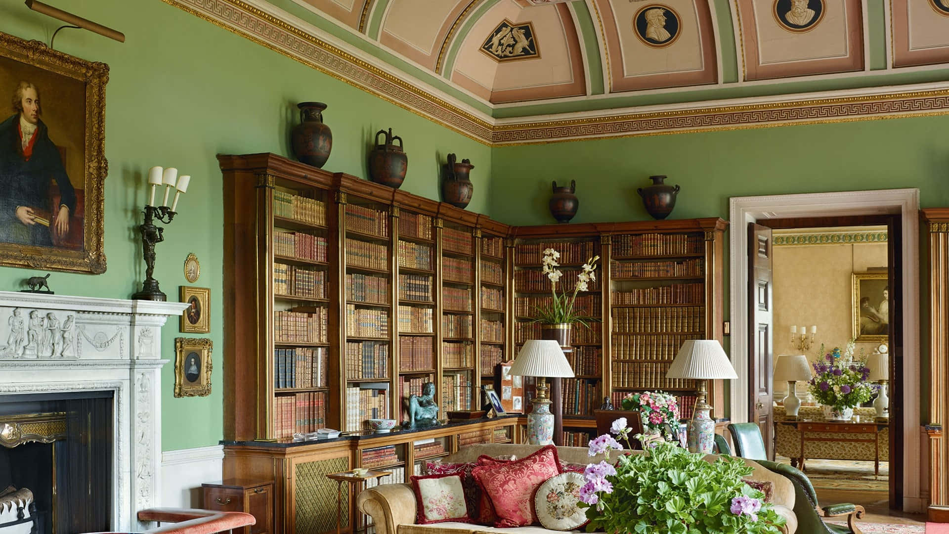 A Living Room With A Fireplace And Bookshelves Wallpaper