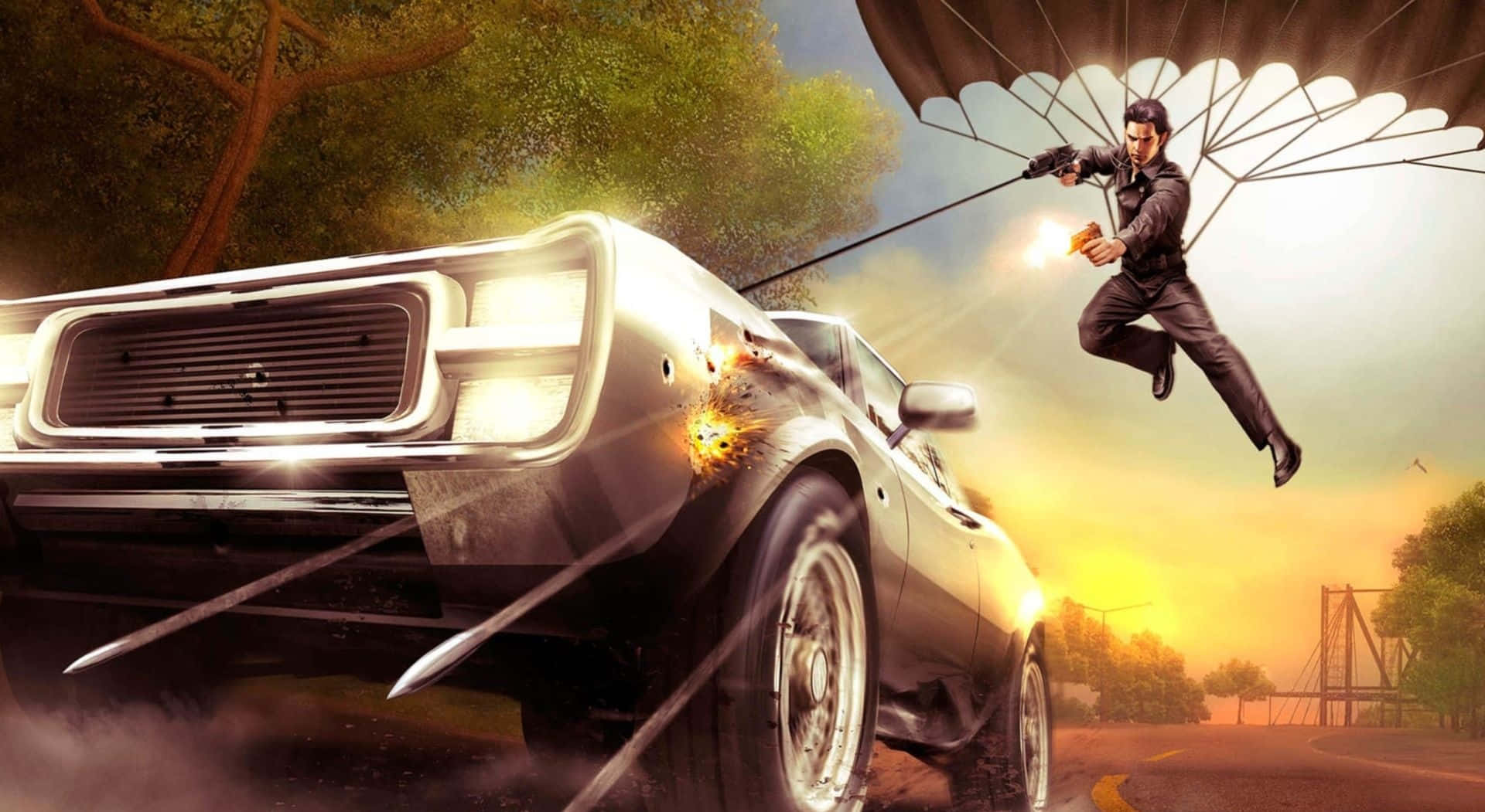 A Man Is Flying Over A Car With A Parachute Wallpaper