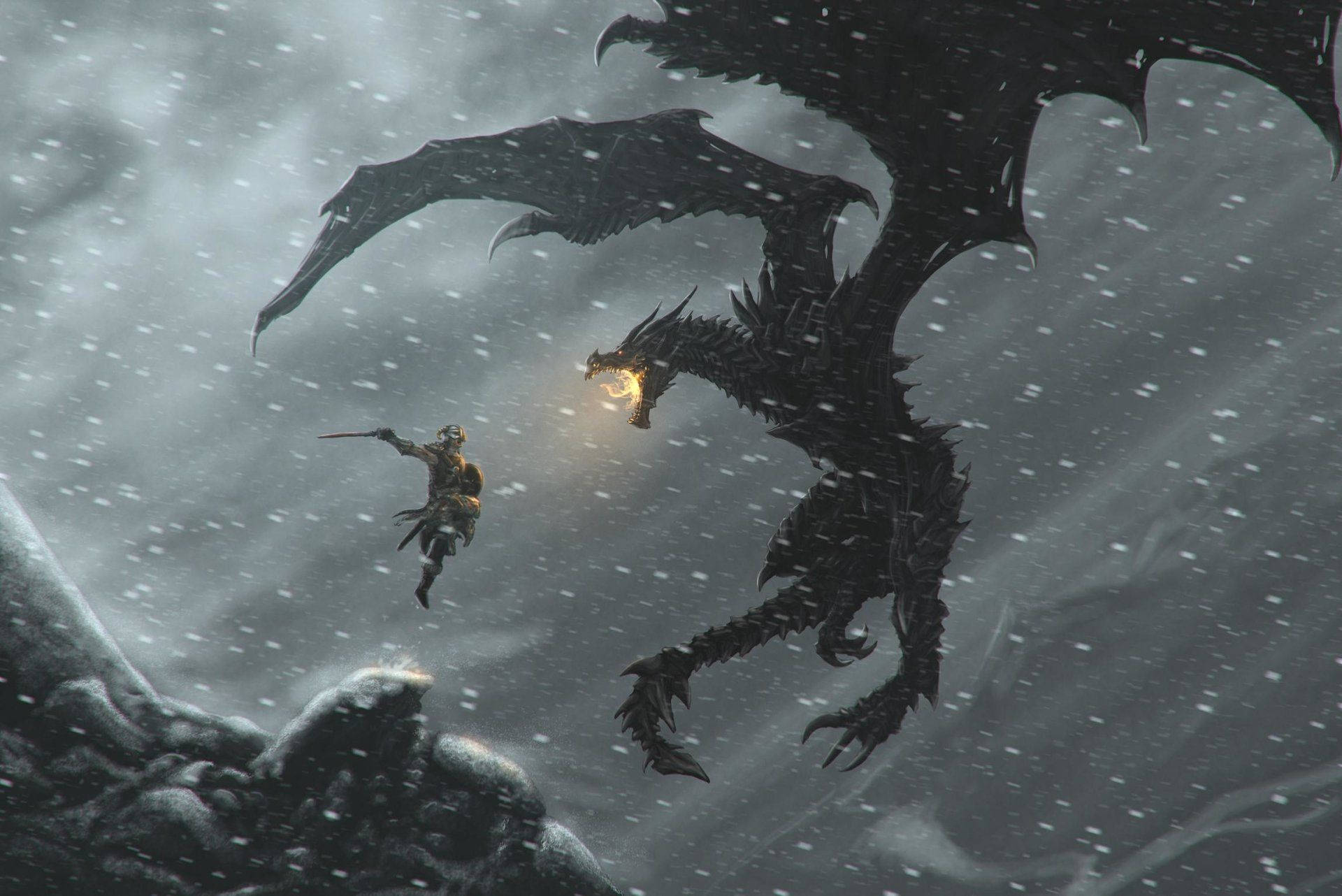A Man Is Standing In The Snow With A Dragon Wallpaper