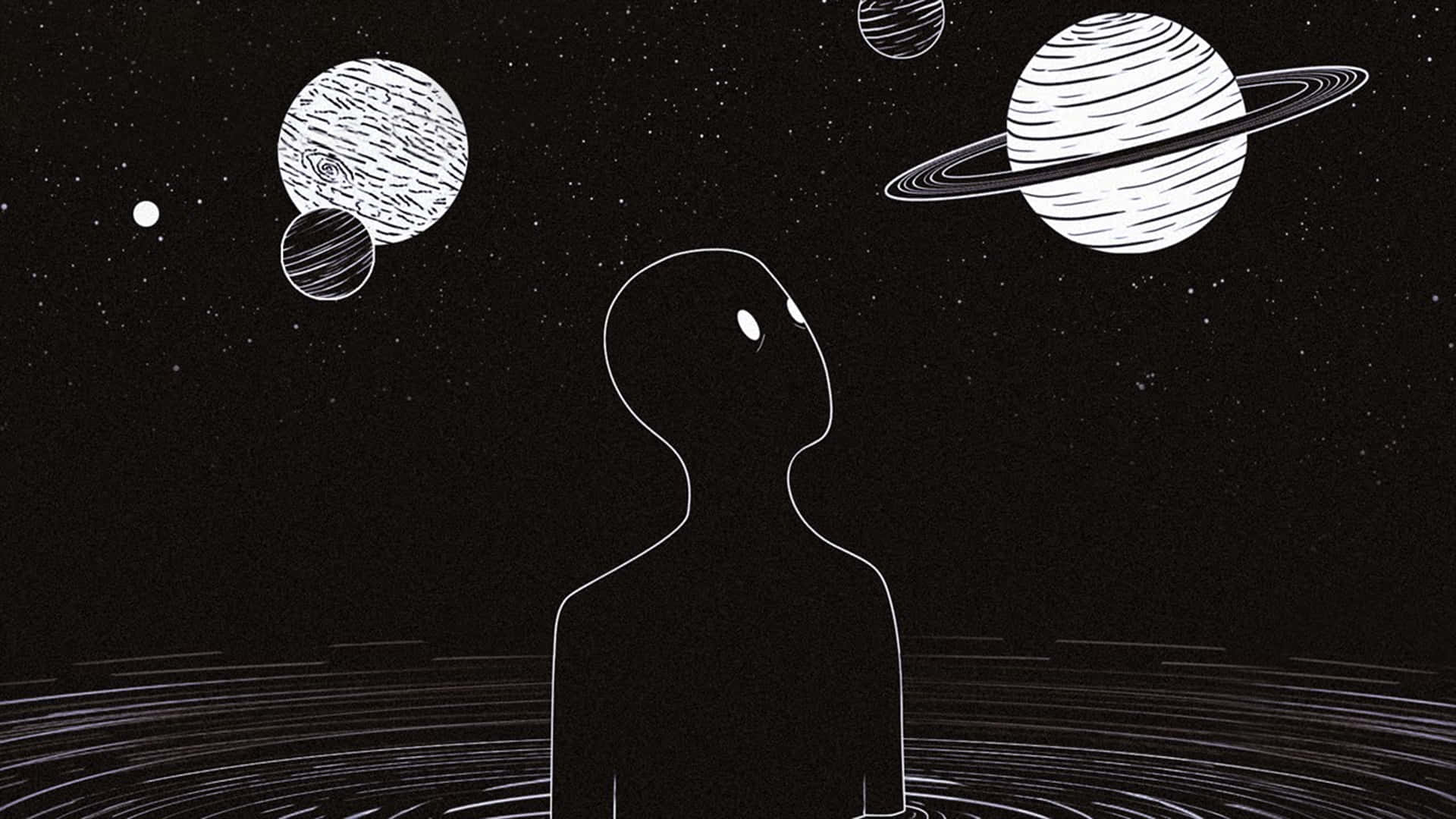 A Man Is Standing In The Water With Planets Around Him Wallpaper