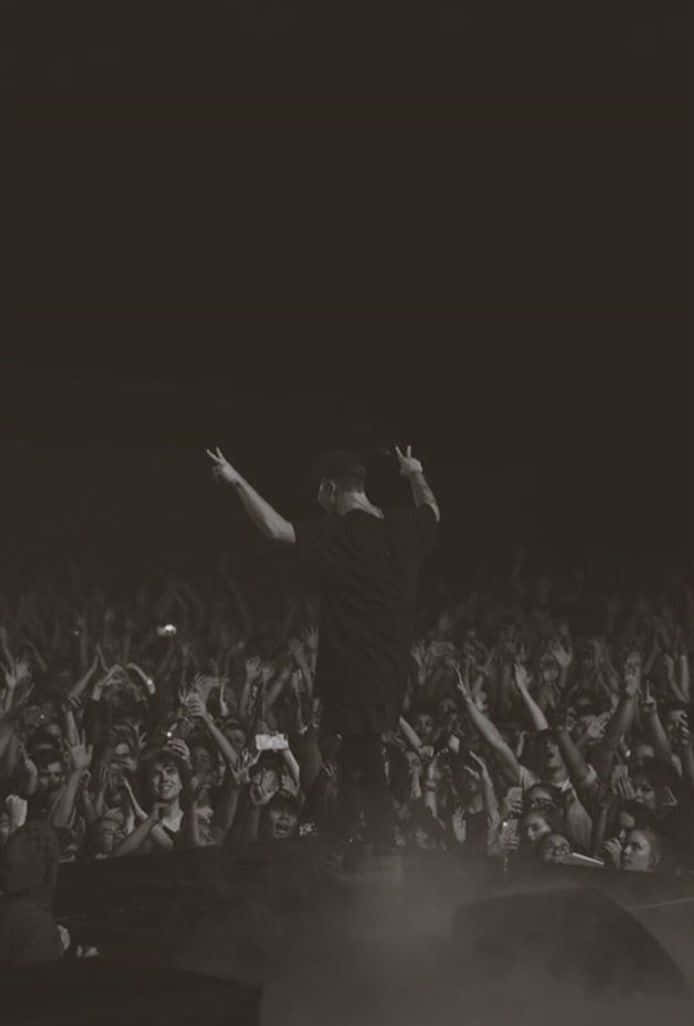 A Man Is Standing On Stage With His Arms Raised Wallpaper
