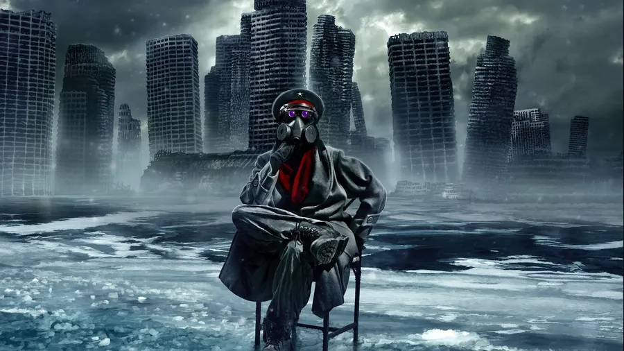A Man Sitting On A Chair In Front Of A City Wallpaper