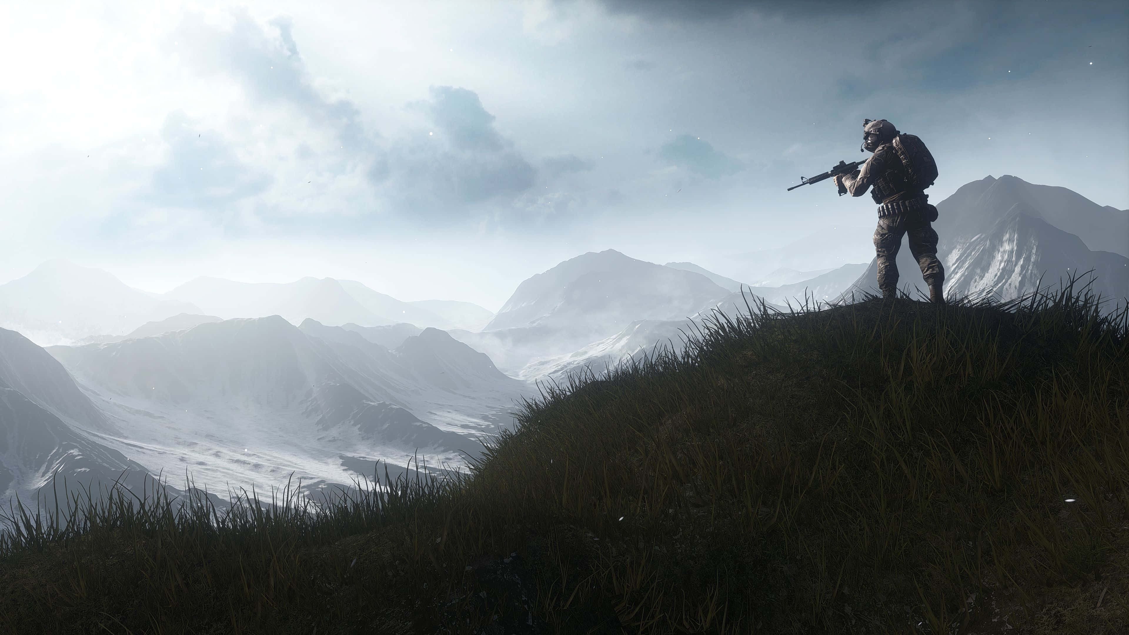 A Man Standing On Top Of A Mountain With A Rifle Wallpaper