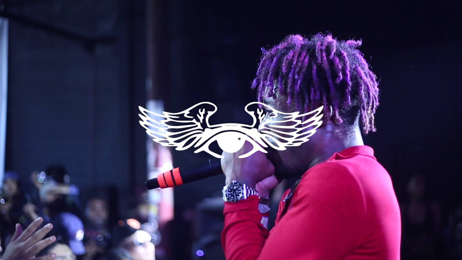 A Man With Purple Hair Is Singing Into A Microphone Wallpaper