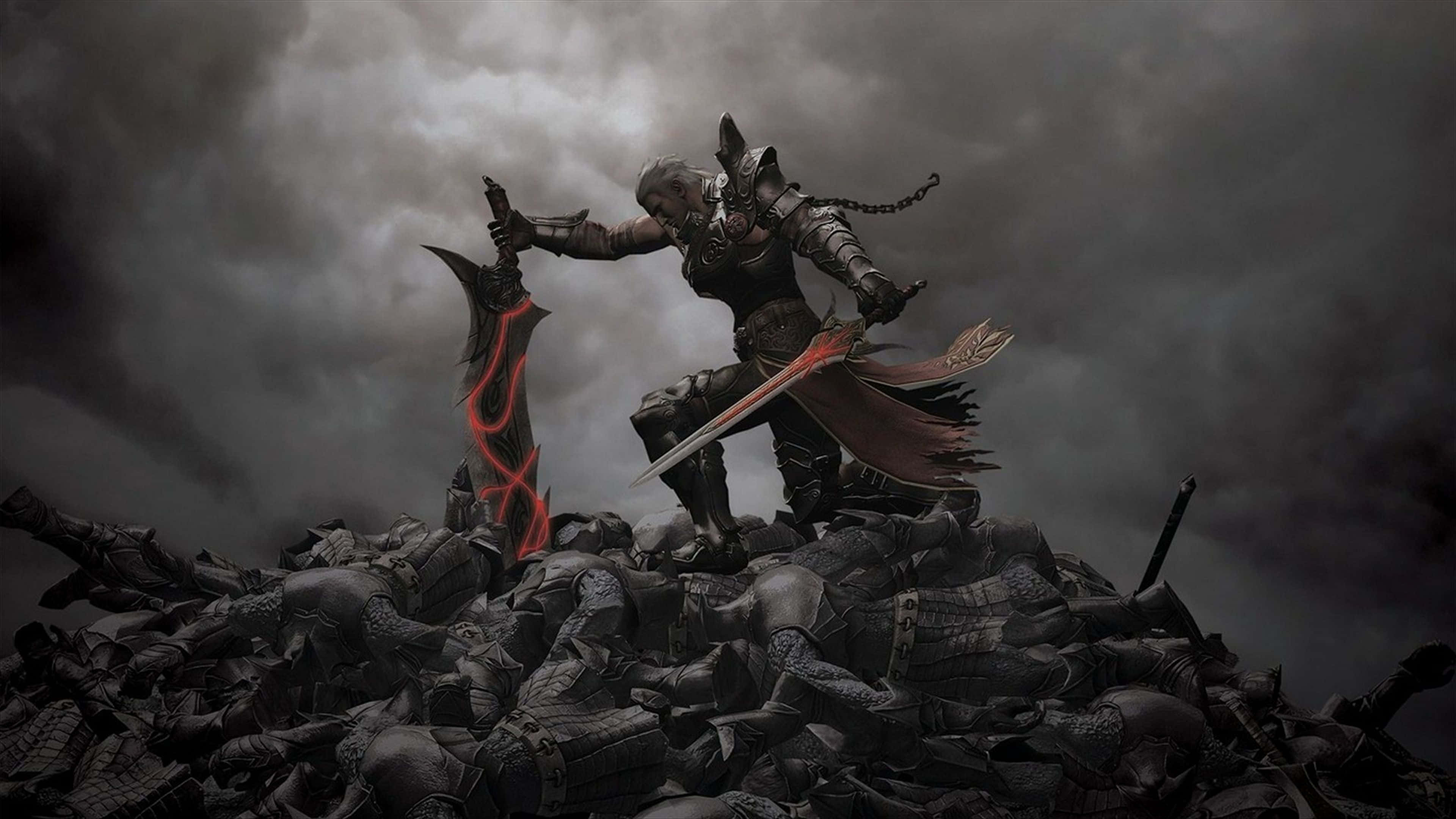 A Man With Swords Standing On Top Of A Pile Of Rocks Wallpaper
