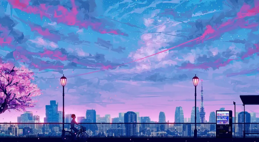 A Painting Of A City With A Sky Full Of Pink And Purple Wallpaper