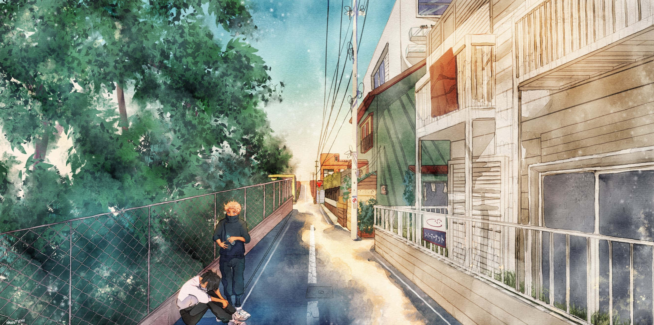 A Painting Of A Street With A Man On A Skateboard Wallpaper