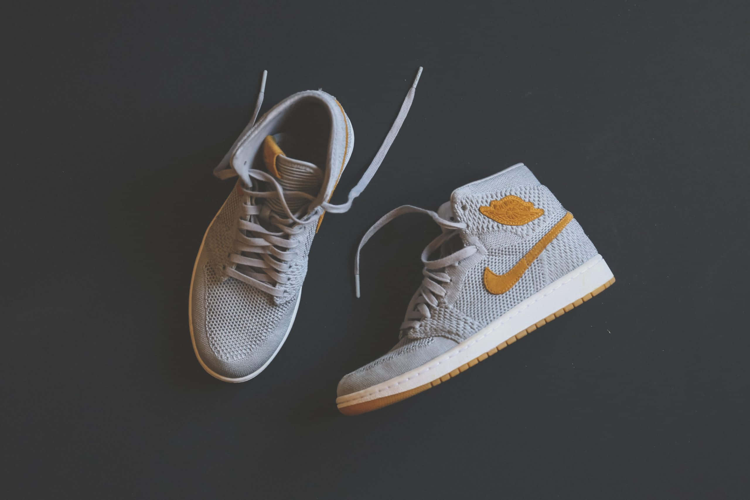 A Pair Of Air Jordan 1 High Sneakers On A Black Surface Wallpaper