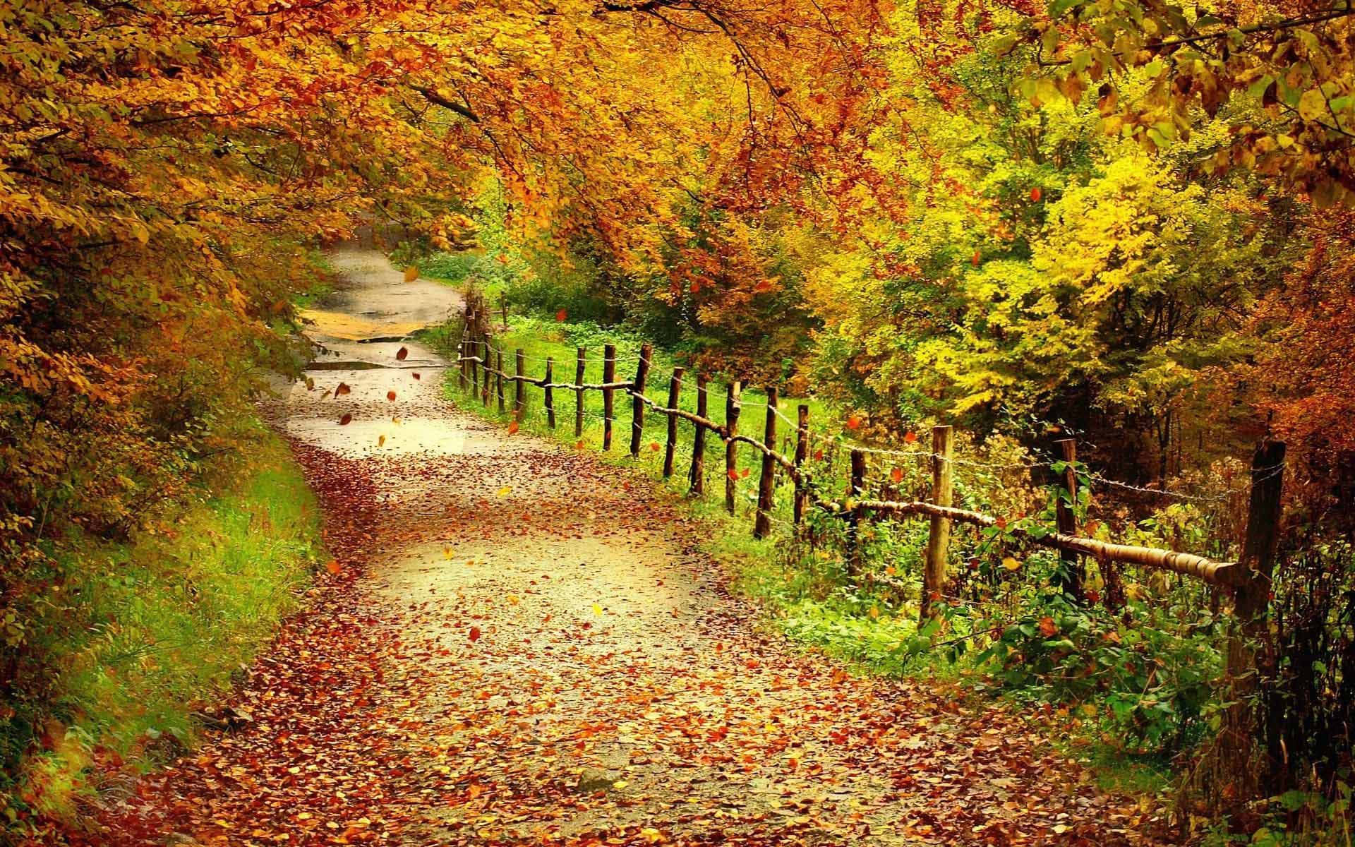 A Path With Leaves And Trees In The Background Wallpaper