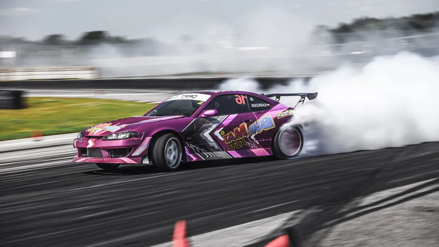 A Pink Drift Car Is Driving Down A Track Wallpaper