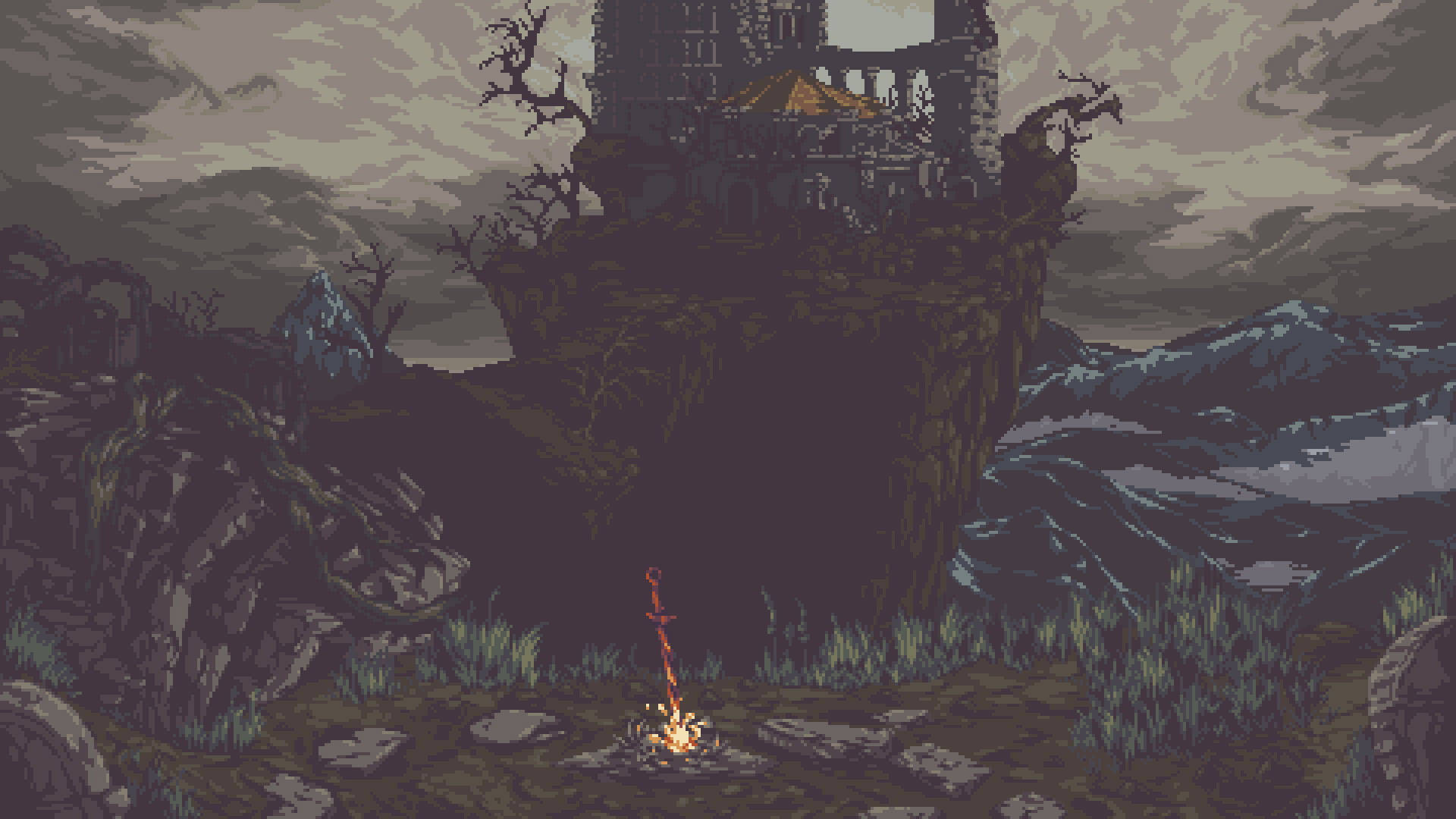 A Pixel Art Image Of A Castle On A Hill Wallpaper