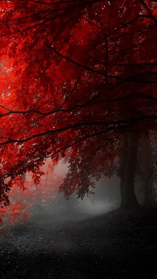 A Red Forest With Trees In The Fog Wallpaper