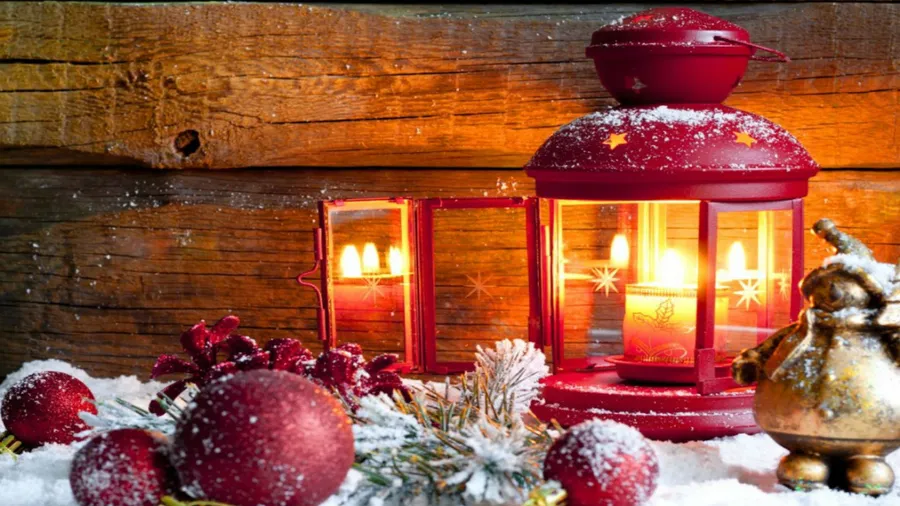 A Red Lantern With Candles And Ornaments On A Wooden Background Wallpaper