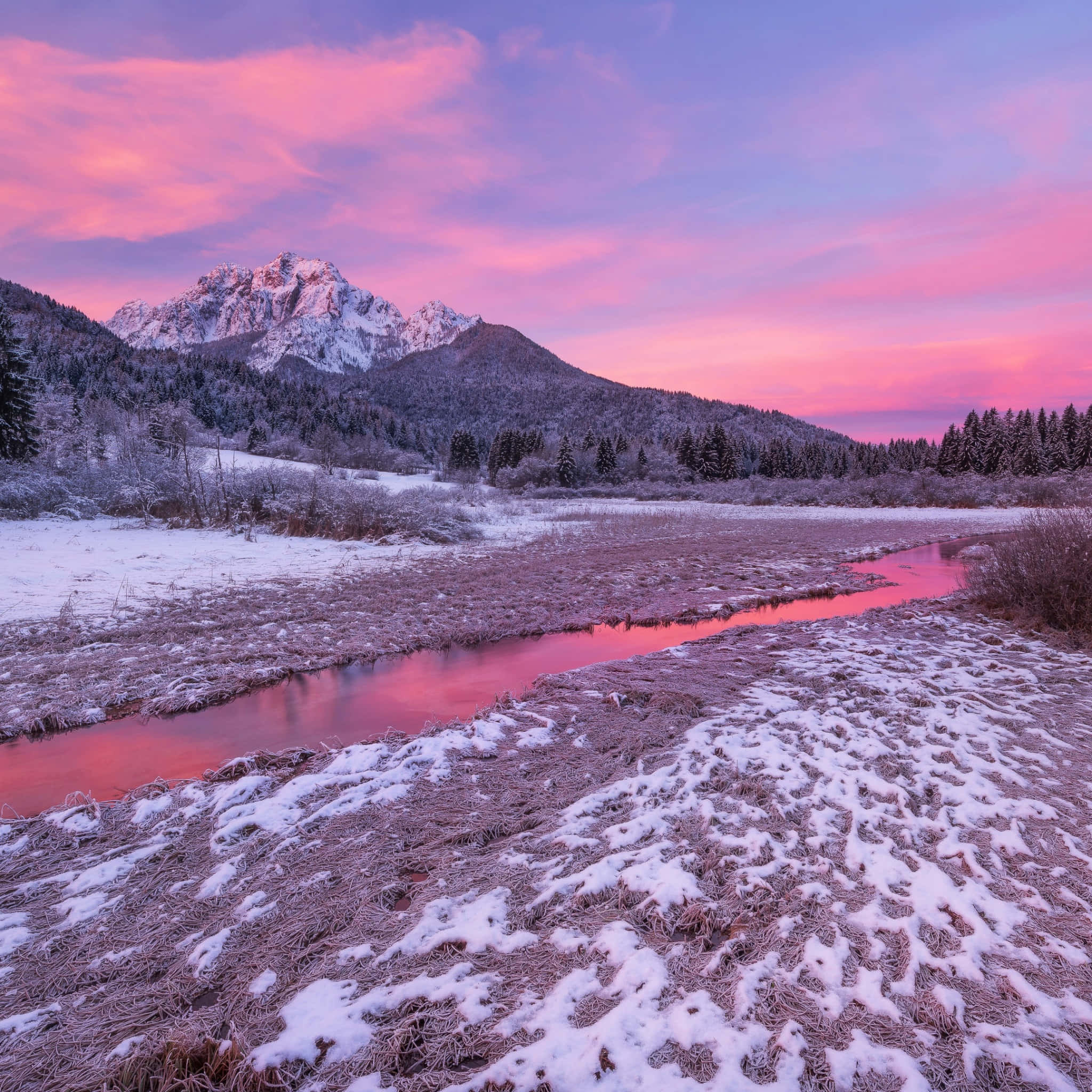 A Snowy Mountain With A Pink Sky And A River Wallpaper