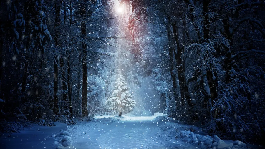 A Snowy Path With A Light Shining Through It Wallpaper