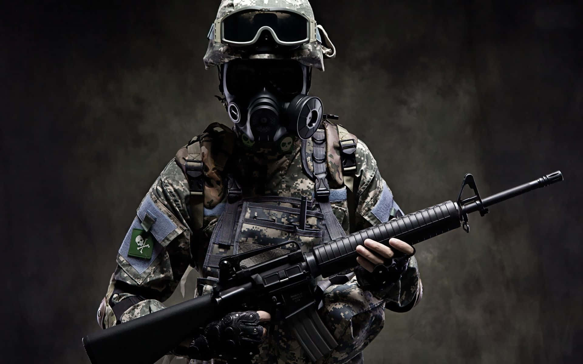 A Soldier In A Gas Mask Holding A Rifle Wallpaper
