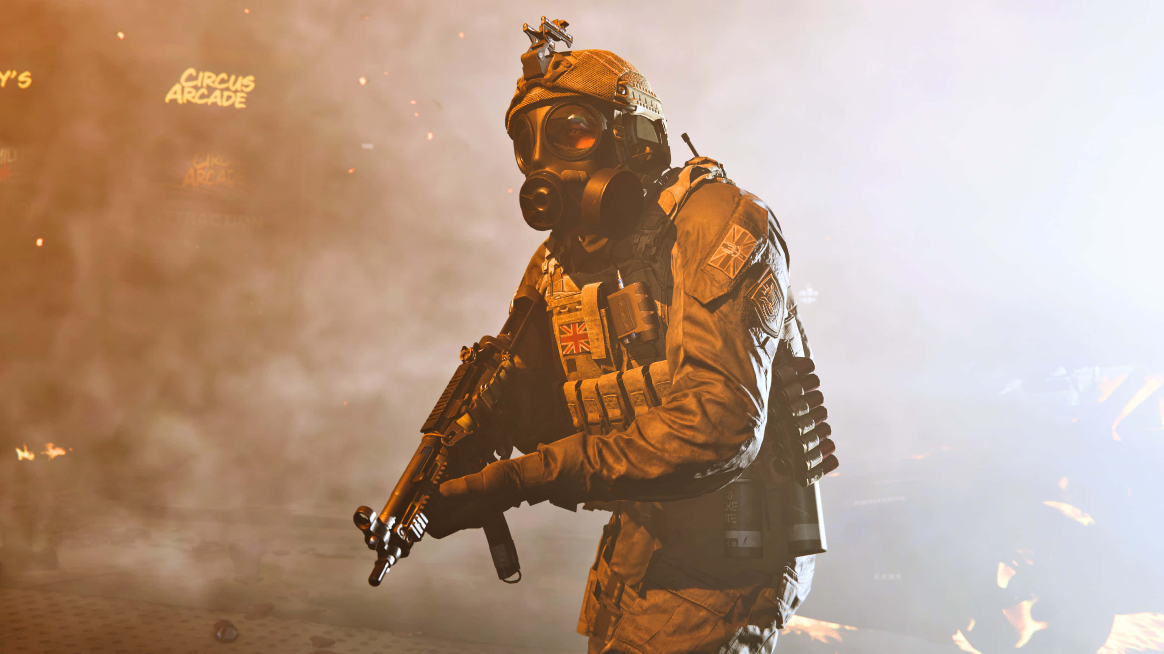 A Soldier In A Gas Mask Is Standing In Front Of A Fire Wallpaper