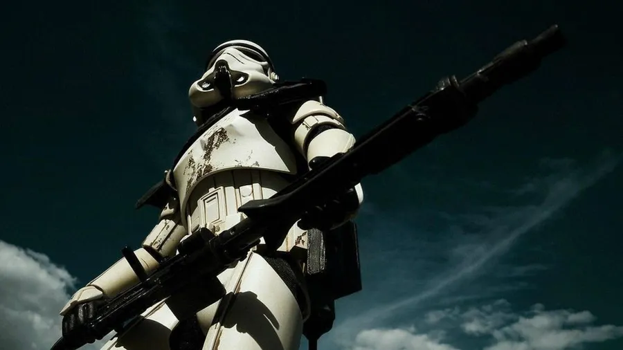A Stormtrooper Is Standing In The Sky With A Rifle Wallpaper