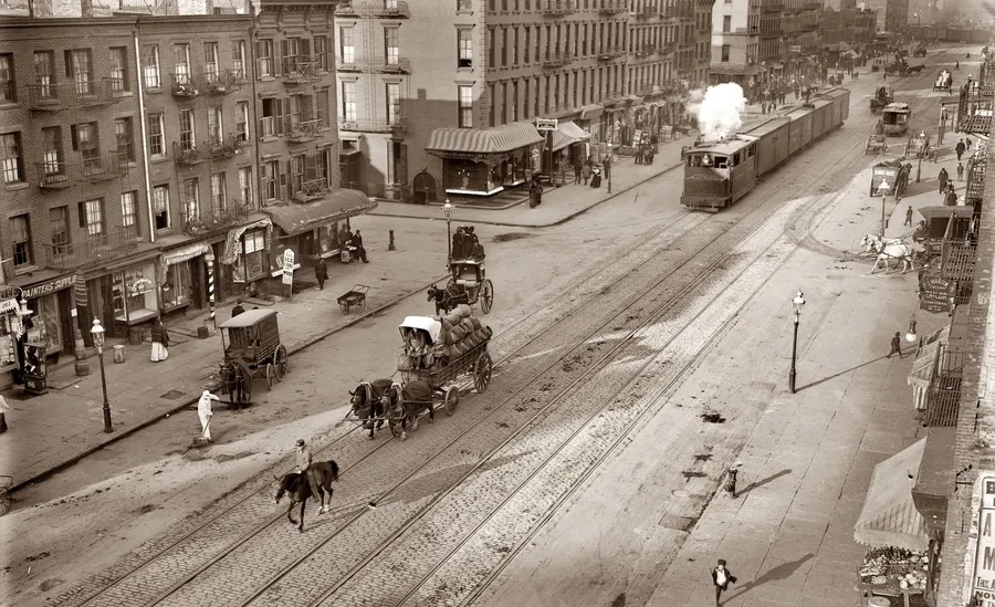 A Street With A Train And Horses Wallpaper