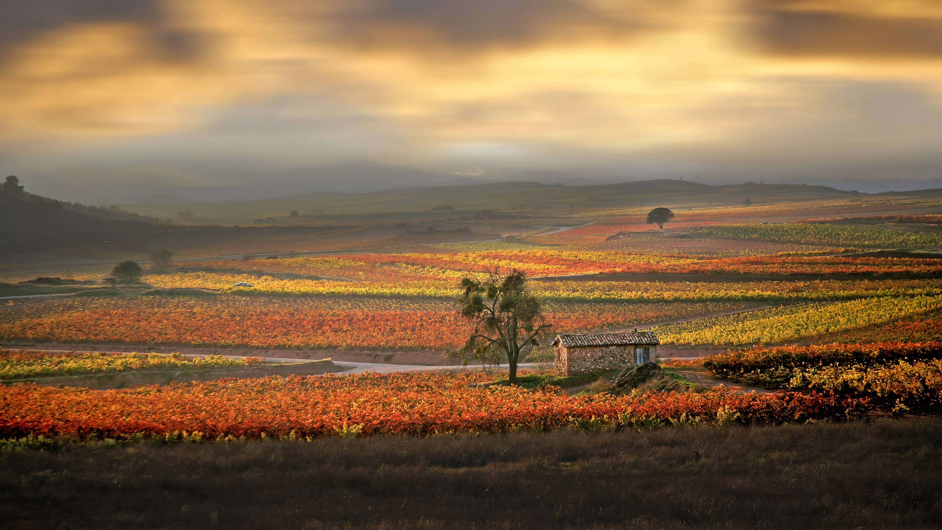 A Vineyard Field With Trees And A House Wallpaper