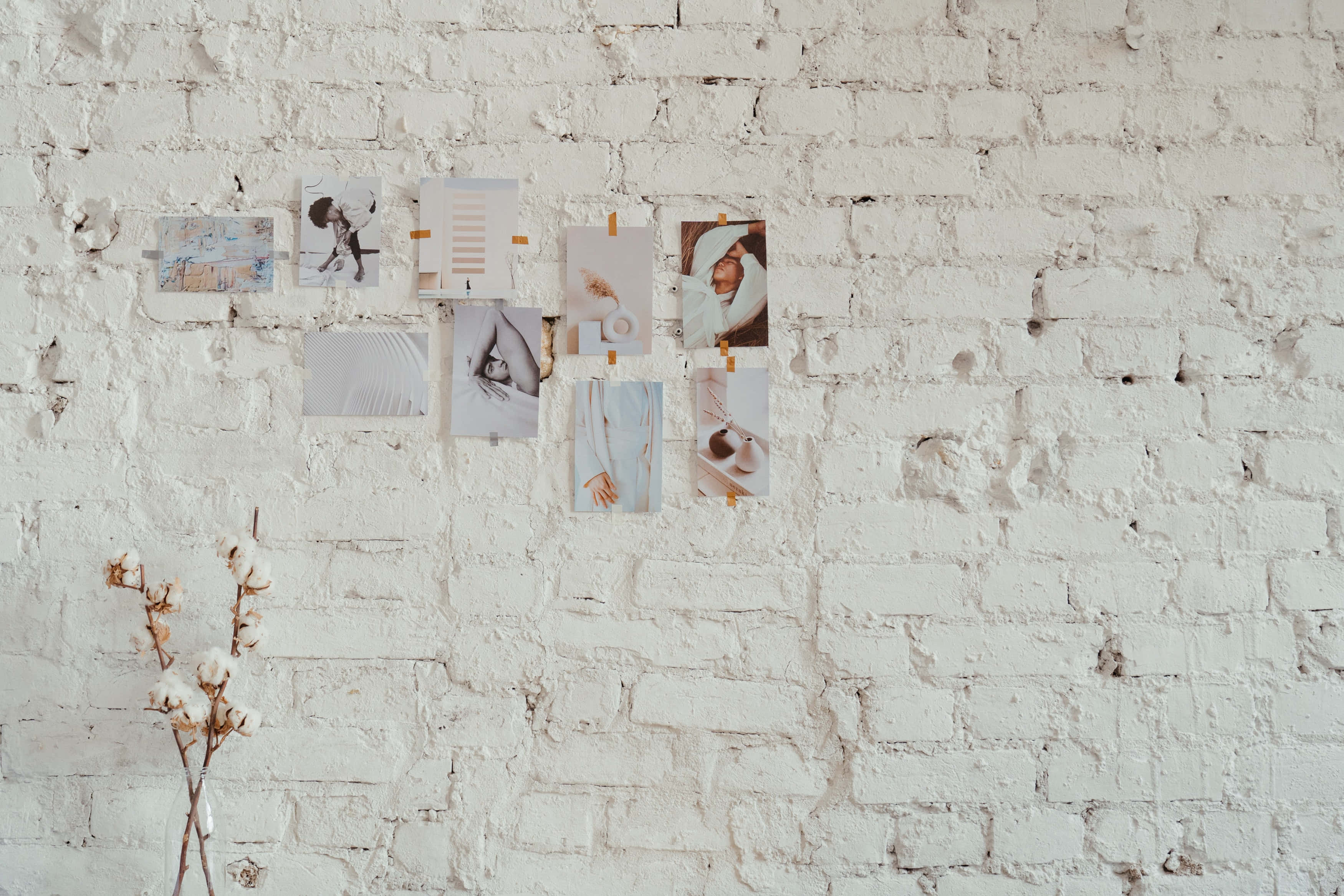 A White Brick Wall With A Vase And Some Photos Wallpaper