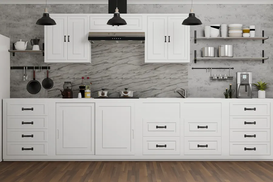 A White Kitchen With Wood Floors Wallpaper