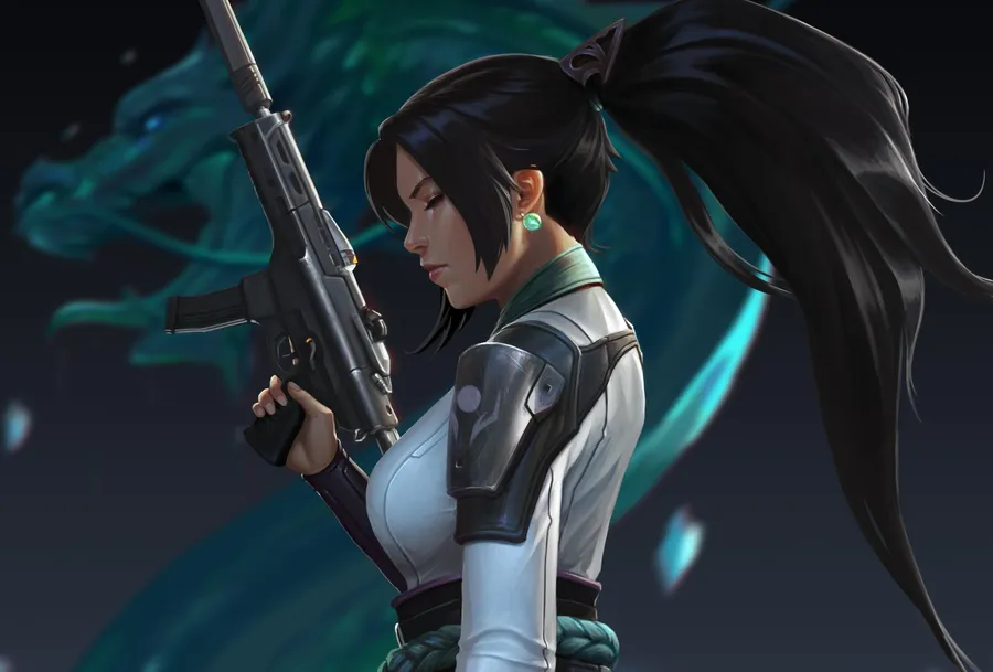 A Woman Holding A Gun With A Dragon Behind Her Wallpaper
