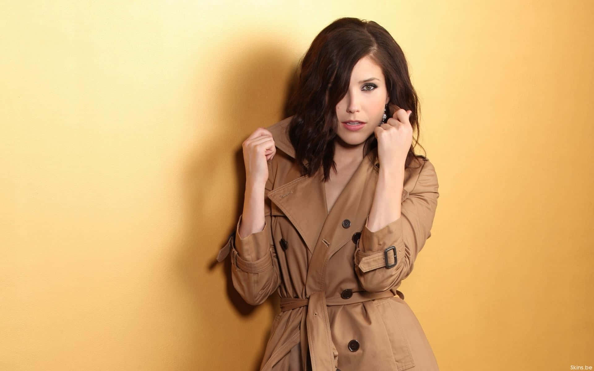 A Woman In A Trench Coat Leaning Against A Yellow Wall Wallpaper