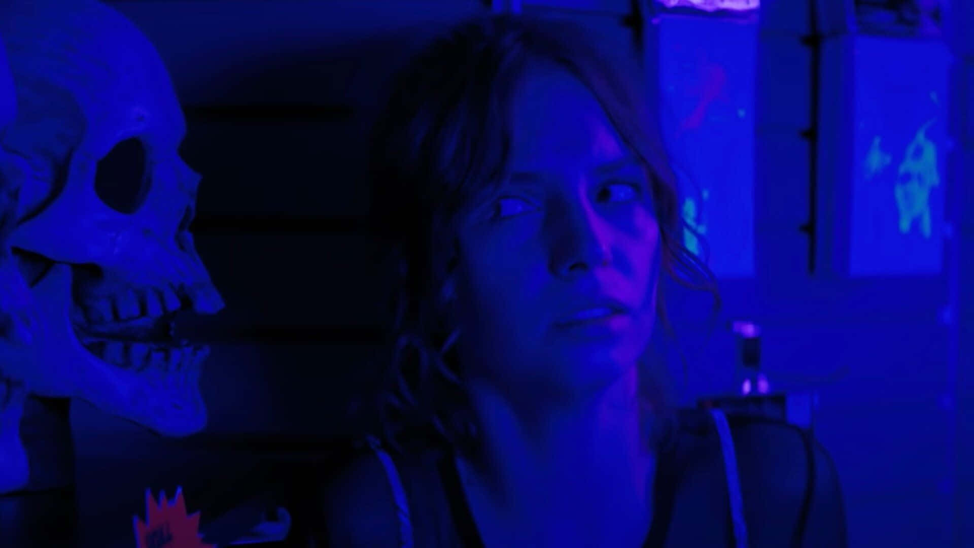 A Woman Is Standing In Front Of A Blue Wall Wallpaper