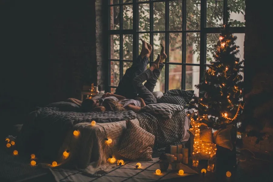 A Woman Laying On A Bed With Christmas Lights Wallpaper