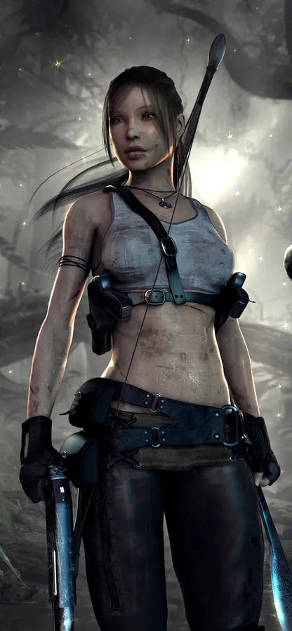 A Woman With A Sword And A Knife Is Standing In The Woods Wallpaper