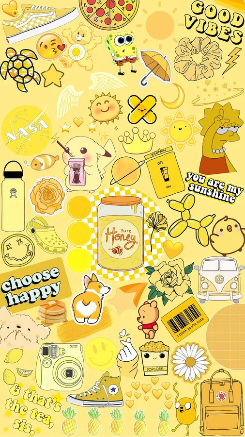 A Yellow Background With Various Stickers On It Wallpaper