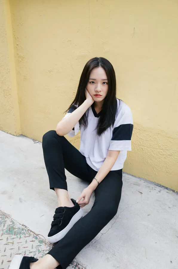 A Young Woman Sitting On The Ground Wearing Black Pants And White T – Shirt Wallpaper