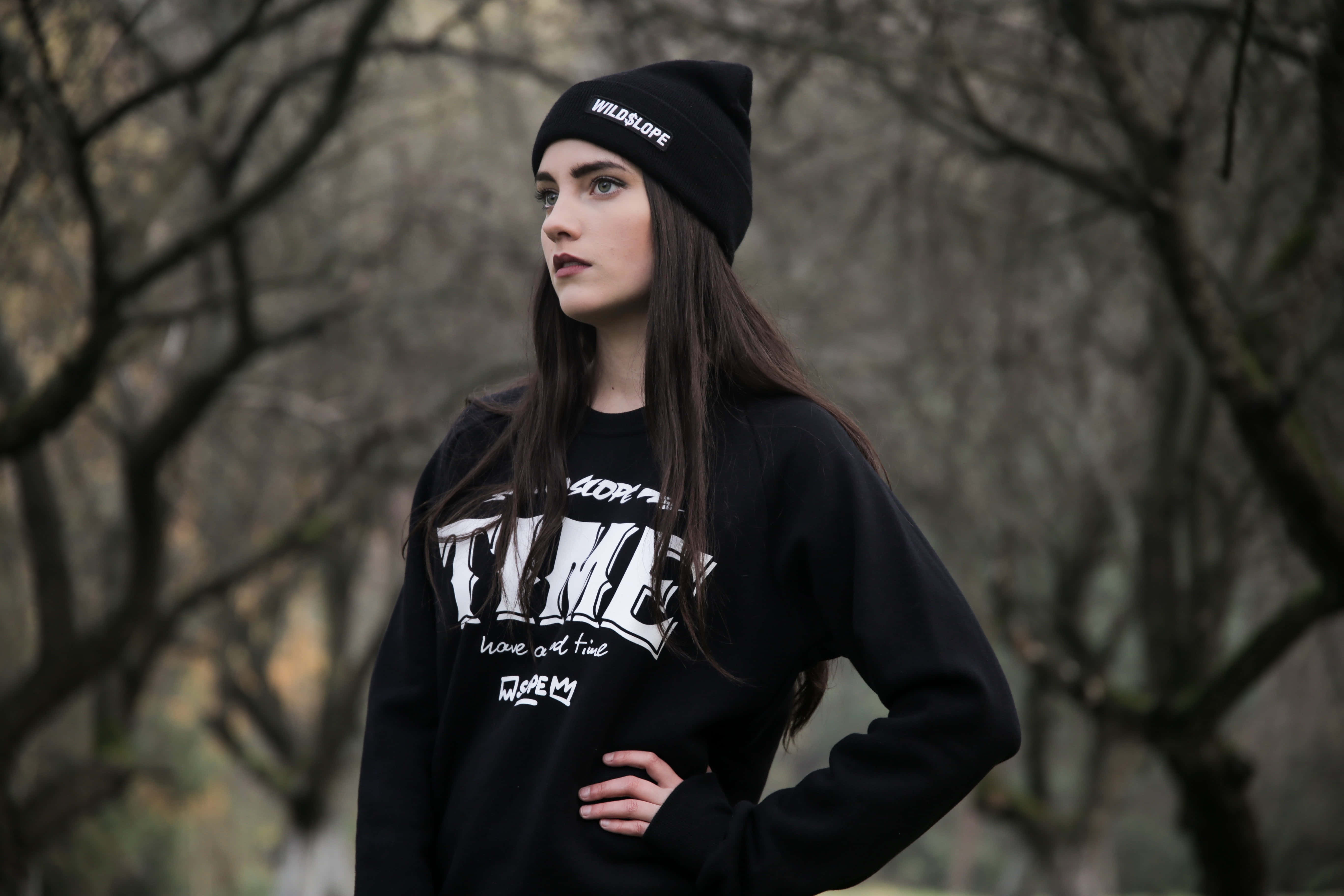 A Young Woman Wearing A Black Sweatshirt And Beanie Wallpaper