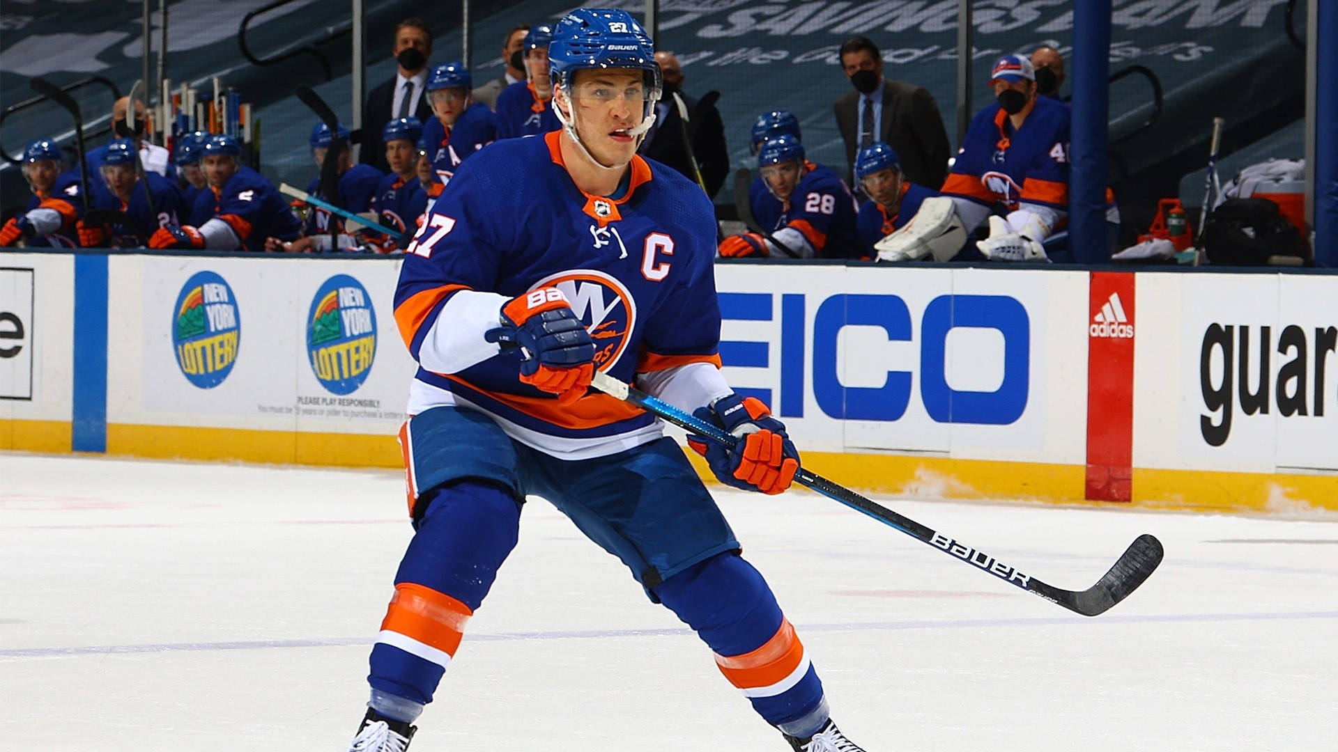 Anders Lee Number 27 In Action Against Chicago Blackhawks Wallpaper