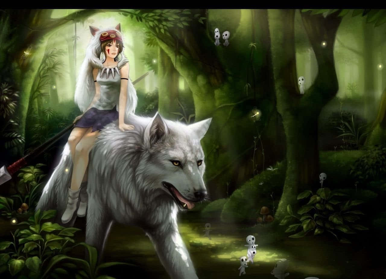 Anime Girl Riding Giant Wolf Fantasy Forest Wallpaper