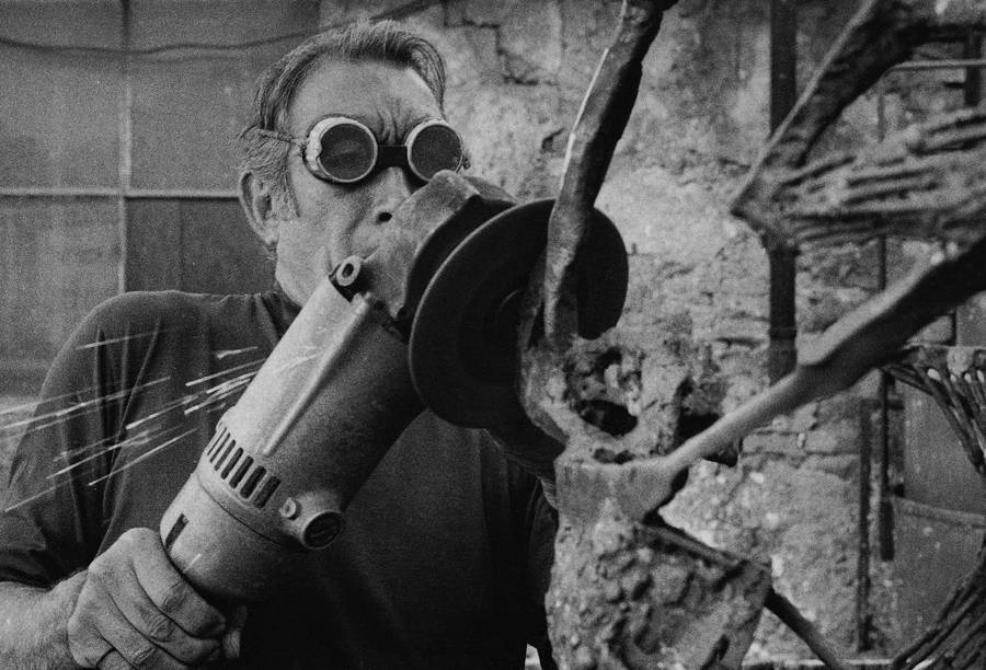 “anthony Quinn Engrossed In Welding Artistry – Workshop Scene” Wallpaper